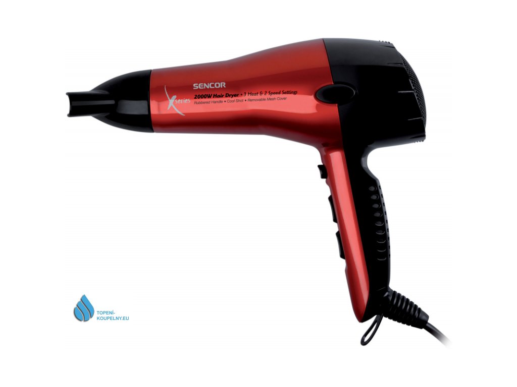 Příkon 2000 W, ultralehká konstrukce, 3 stupně nastavení teploty, 2 stupně nastavení rychlosti, studený vzduch, usměrňovací tryska, odnímatelná zadní mřížka pro snažší čištění, pogumovaná zadní část rukojeti, závěsné očko, gumové ochranné boční nárazníky zabraňující odření fénu při odložení, tepelná pojistka proti přehřátí motoru, délka přívodní šňůry 2.6 m, červená barva, rozměry (š x v x h): 120 x 220 x 80 mm.